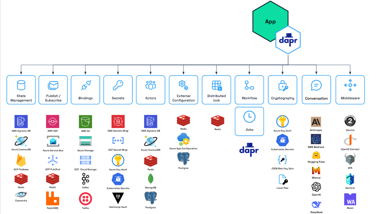 Dapr uses a modular design where functionality is delivered as a component. Each component has an interface definition. All of the components are interchangeable so that you can swap out one component with the same interface for another.
