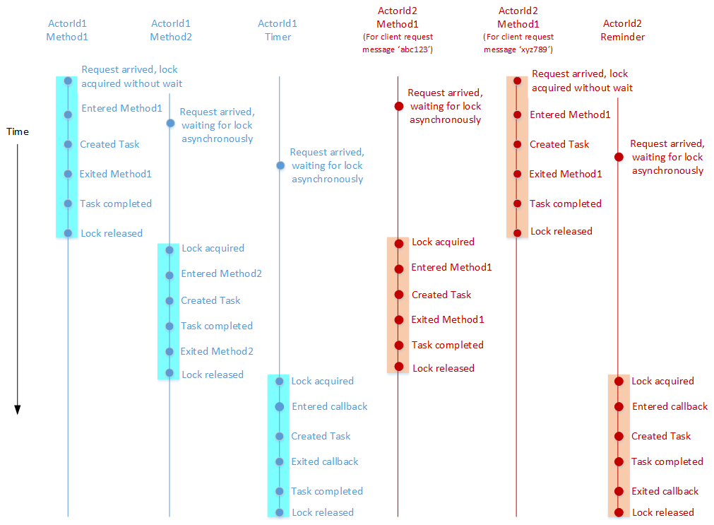 The following example illustrates the above concepts. Consider an actor type that implements two asynchronous methods (say, Method1 and Method2), a timer, and a reminder. The diagram below shows an example of a timeline for the execution of these methods and callbacks on behalf of two actors (ActorId1 and ActorId2) that belong to this actor type.