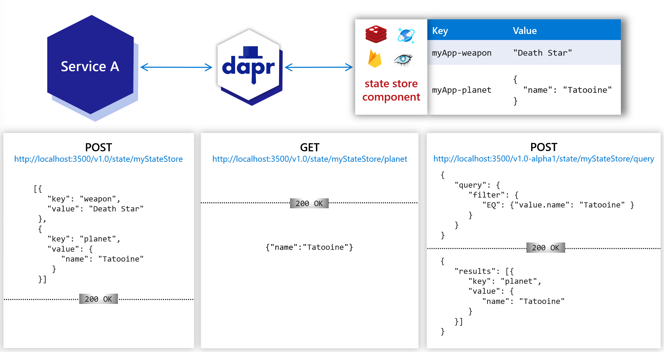 The following overview video and demo demonstrates how Dapr state management works.
