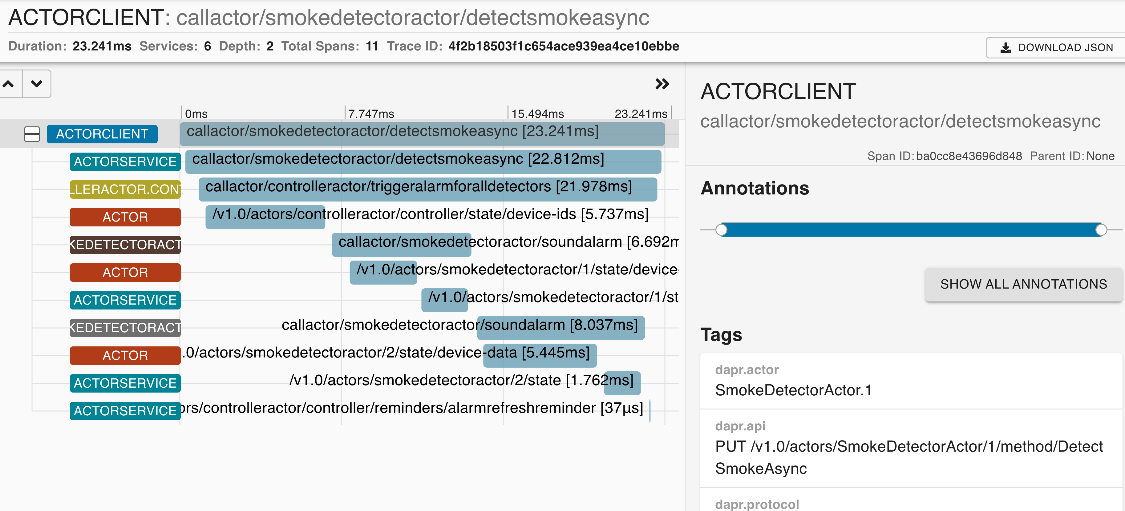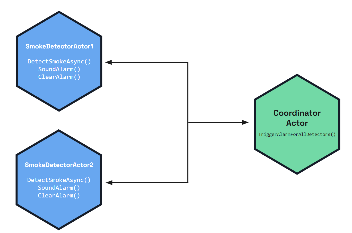DetectSmokeAsyncmethod ofSmokeDetectorActor 1is called.public async Task DetectSmokeAsync() { var controllerActorId = new ActorId("controller"); var controllerActorType = "ControllerActor"; var controllerProxy = ProxyFactory.CreateActorProxy<IController>(controllerActorId, controllerActorType); await controllerProxy.TriggerAlarmForAllDetectors(); }The