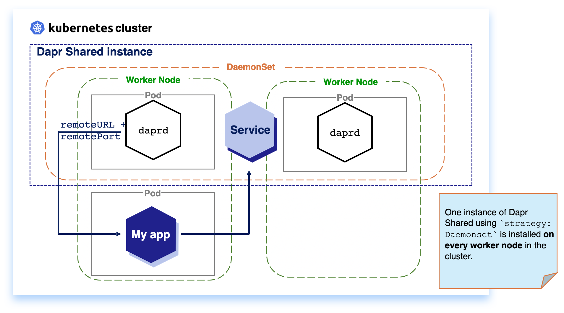 DaemonSet: When running Dapr Shared as a KubernetesDaemonSetresource, the daprd container runs on each Kubernetes node in the cluster. This can reduce network hops between the applications and Dapr.Deployment: When running Dapr Shared as a KubernetesDeployment, the Kubernetes scheduler decides on which single node in the cluster the daprd container instance runs.