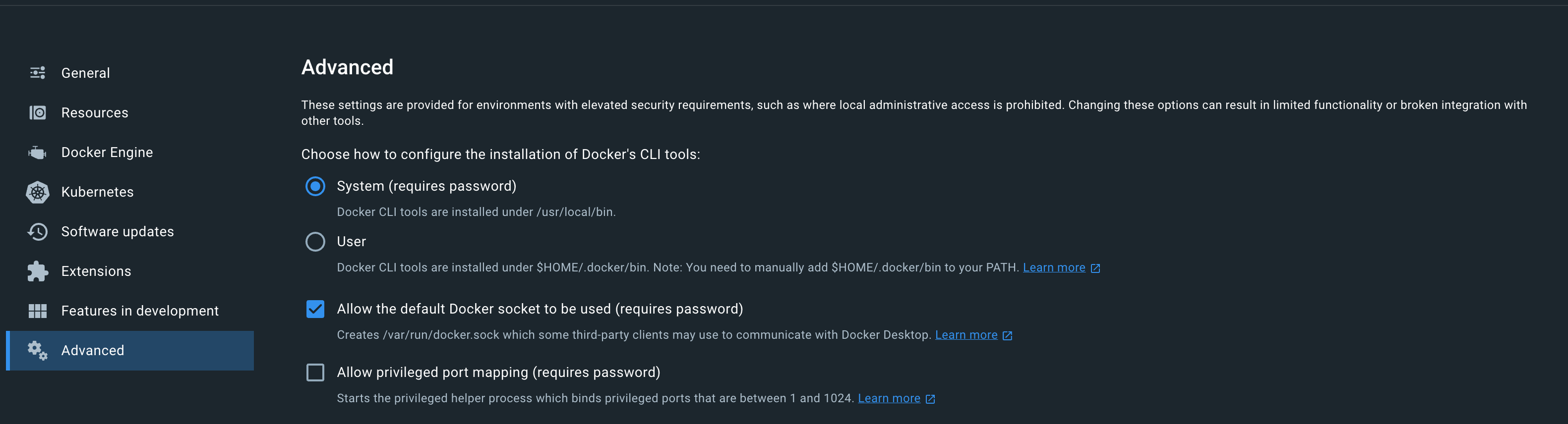 In Docker Desktop, verify the Allow the default Docker socket to be used (requires password) option is selected.